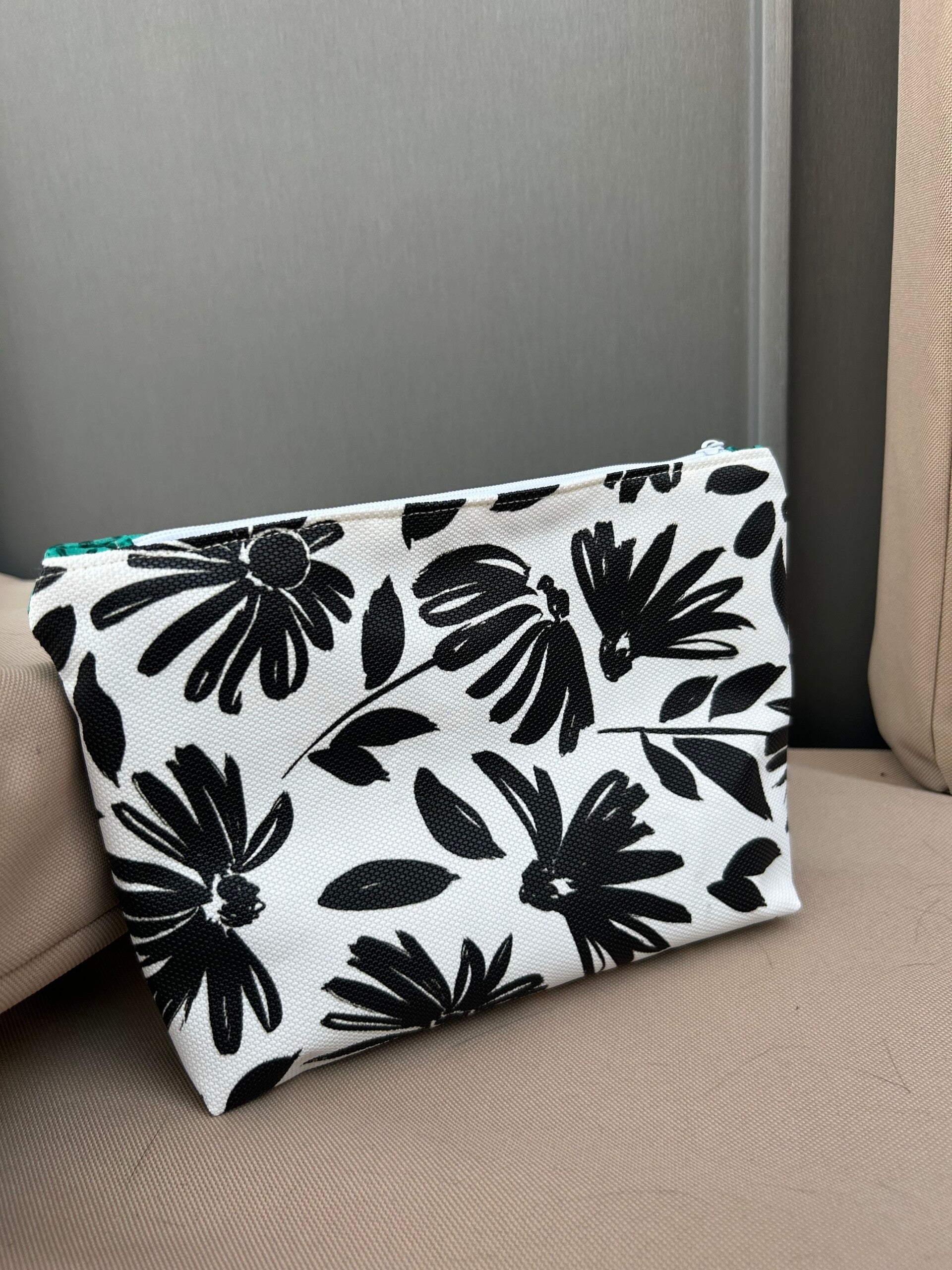 D'un côté, elle arbore un motif saisissant d'écailles de serpent d'un vert émeraude vibrant, parfait pour apporter une touche d'audace et de sophistication. Retournez-la, et vous découvrirez un imprimé floral graphique noir et blanc évoquant des marguerites stylisées, offrant une esthétique moderne et épurée.